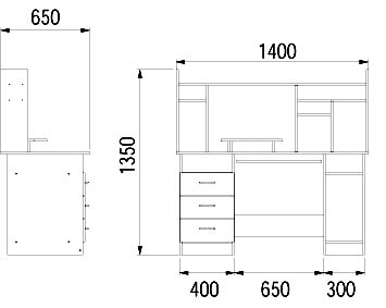 Компьютерные стол Компьютерный стол с/нПолное описание: Компьютерный стол с надстройкой MEBELOFFICEKIEV. Вот самая продаваемая модель компьютерного стола.По своей функциональности не уступит почти никому,но цена всего 760 грн.что и делает его популярнее своих более дорогих собратьев.Этот компьютерный стол имеет очень функциональную надстройку.Итак по порядку. Оснащение: 1)тумба с тремя выдвижными ящиками; 2)выдвижная полка под клавиатуру; 3)полка под системный блок; 4)два отделения для дисков; 5)Надстройка под монитор(съёмная); 6)два отделения под колонки; 7)Полка под принтер; 8)полка под сабвуфер; 9)Верхняя полка позволит разместить дополнительное оборудование,веб-камеру и т.д. 10)Полка в столе для папок и файлов; Компьютерный стол с надстройкой на фото: цвет ольха. Все размеры показаны на схеме. |  | Цена стола : 760 грн. |